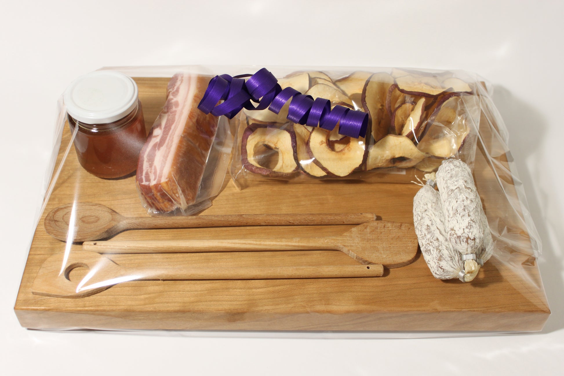 In unserem großen Geschenkbrett erwartet Sie ein exquisites Set aus Kochlöffeln sowie eine vielfältige Palette köstlicher Knabbereien und Lebensmittel. Inhalt: Honig, Salami, Kochlöffelset, Speck, Apfelringe.